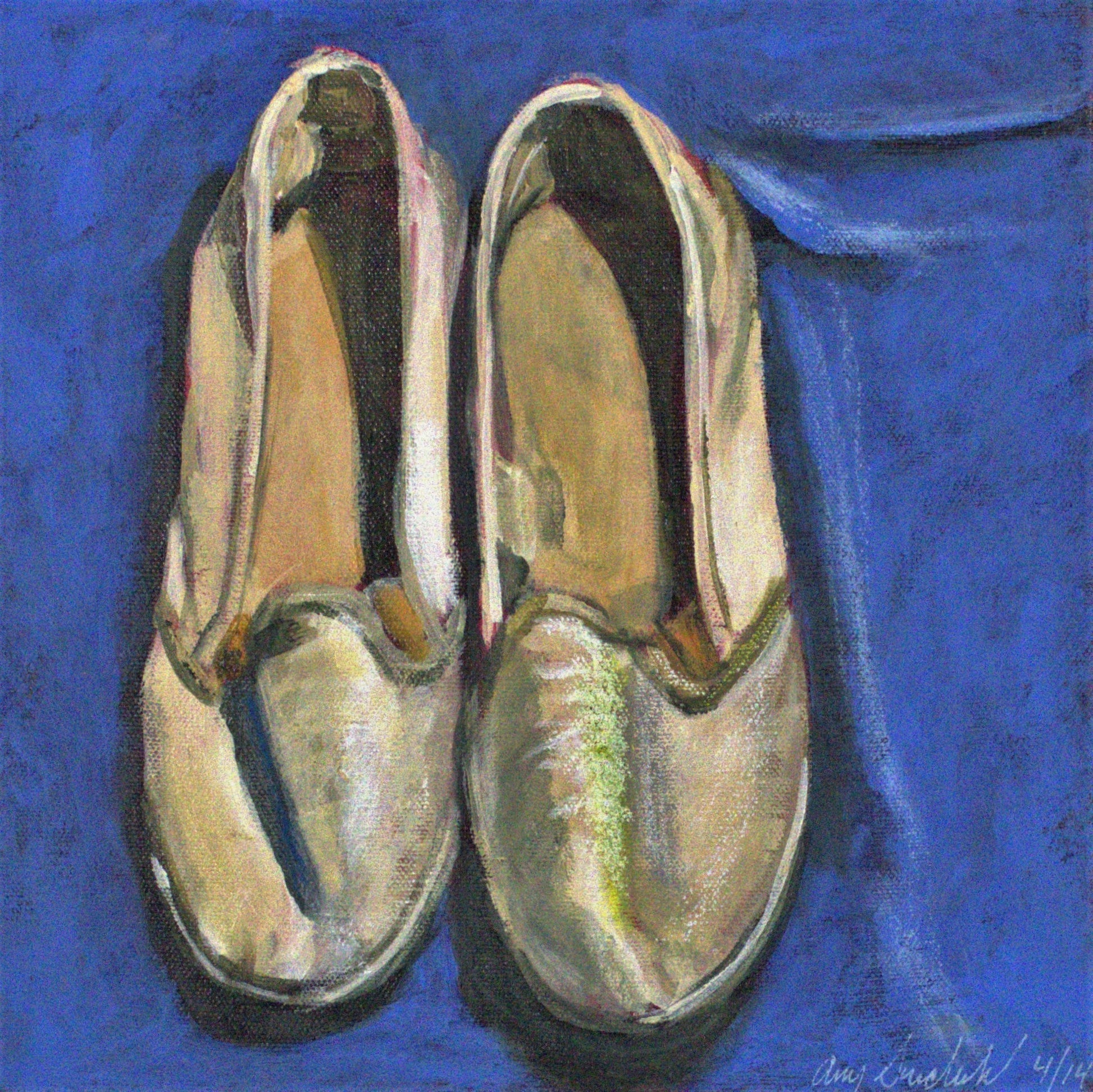 White canvas shoes on an electric blue background. These were works shoes during a memorable time in my life.